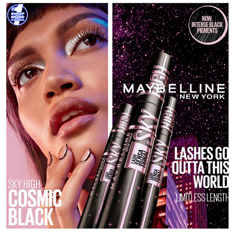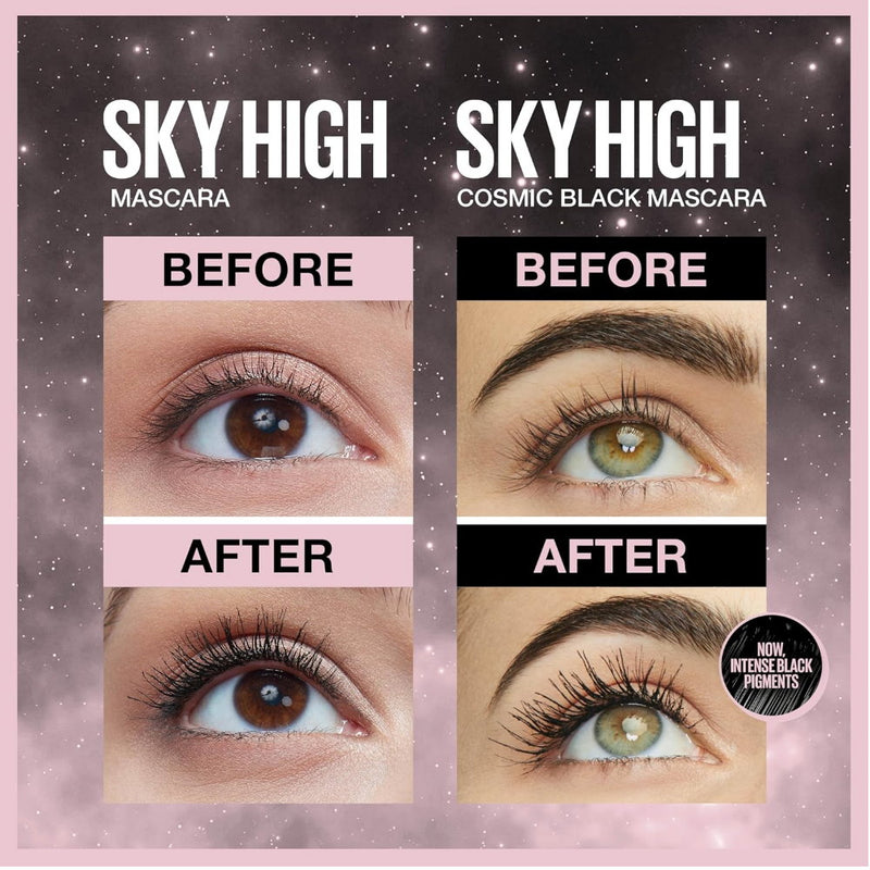 Maybelline Sky High Mascara's iconic limitless length and volume now delivers impact from every angle with space black intensity! This mascara has cosmic black pigments for long lashes with intense black pigment impact. Exclusive Flex Tower mascara brush bends to volumise and extend every single lash from root to tip. Washable mascara formula infused with bamboo extract and fibres for long, full lashes that never get weighed down.