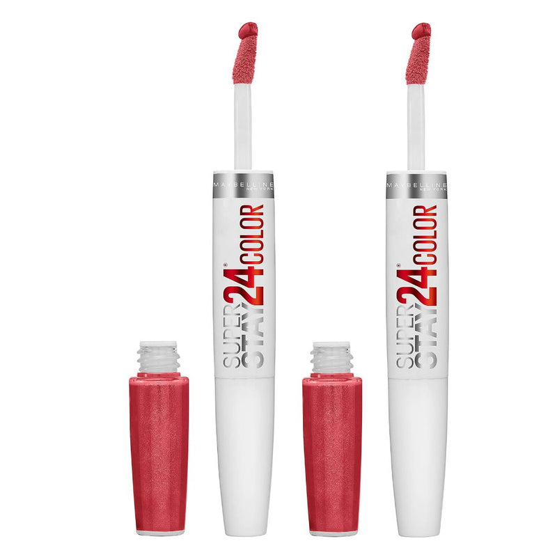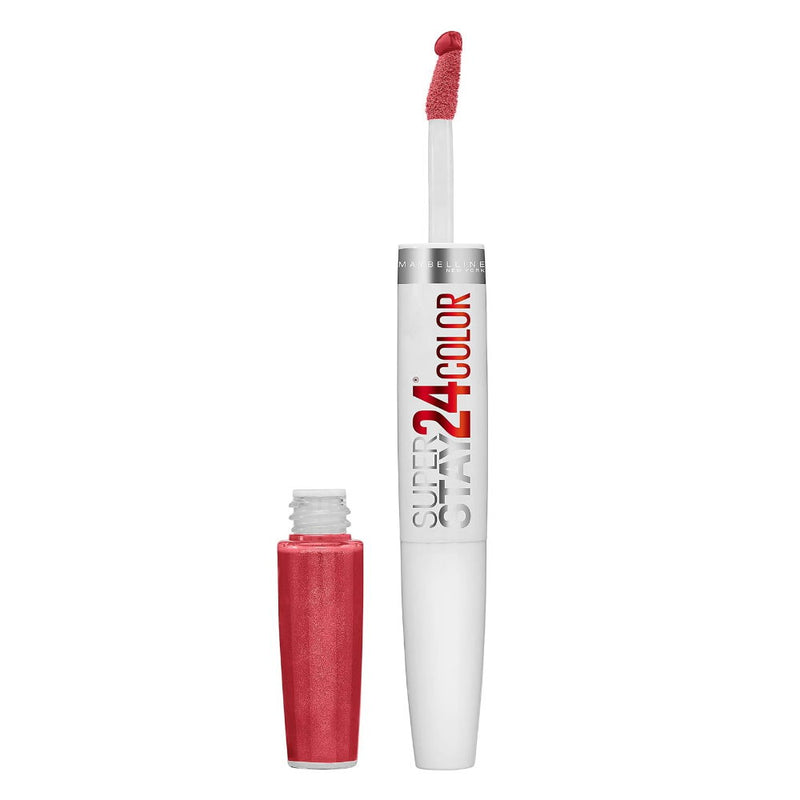 Stretch the limits of long-wearing color with Maybelline's SuperStay 24 2-Step Longwear Liquid Lipstick. This dual-ended product features a long wear liquid lipstick and ultra-conditioning balm. This liquid lipstick formula features Micro flex technology that won't cake, flake, or dry. Our lip colour looks freshly applied through 200 bites, 120 sips, and countless kisses. The conditioning lip balm seals in moisture and keeps lips hydrated. Available in a collection of all-day shades ranging from seductive Keep It Red to timeless So Pearly Pink.