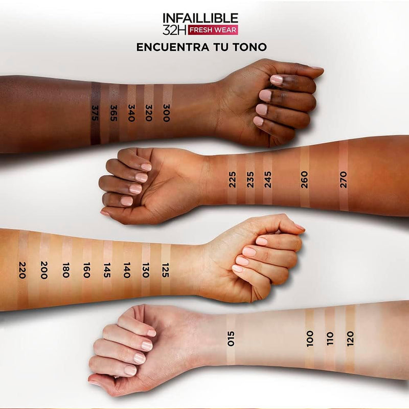 See your skin in its best light yet thanks to the Infallible 32H Fresh Wear Foundation which is both long-lasting and lightweight. L'Oréal Paris presents its most breathable longwear foundation, now formulated with a combination of two powerful ingredients: Vitamin Cg which helps the skin look smoother and brighter in 4 weeks, as well as the light diffusing micro-pearls, making it luminous from the first swipe. Erase your skin's dullness instantly with this long-wear yet lightweight foundation. Designed to last for up to 32hours while still allowing the skin to breathe. A transfer-resistant finish that won’t shift on the skin throughout the day and is resistant against water and sweat. The formula is lightweight with no cakey or heavy feeling and can build to the desired level of coverage. This luminous foundation is available in 24 shades, evenly split between light, medium, and deep tones, so that every skin tone can become flawless, i.e., "Infallible". Our Fresh Wear foundation is designed to be perfect inside and out, featuring a modern and sleek bottle that can be recycled. Indulge in an ultimate skincare and beauty experience, with our buildable, luminous formula that will make your skin feel radiant all day long.