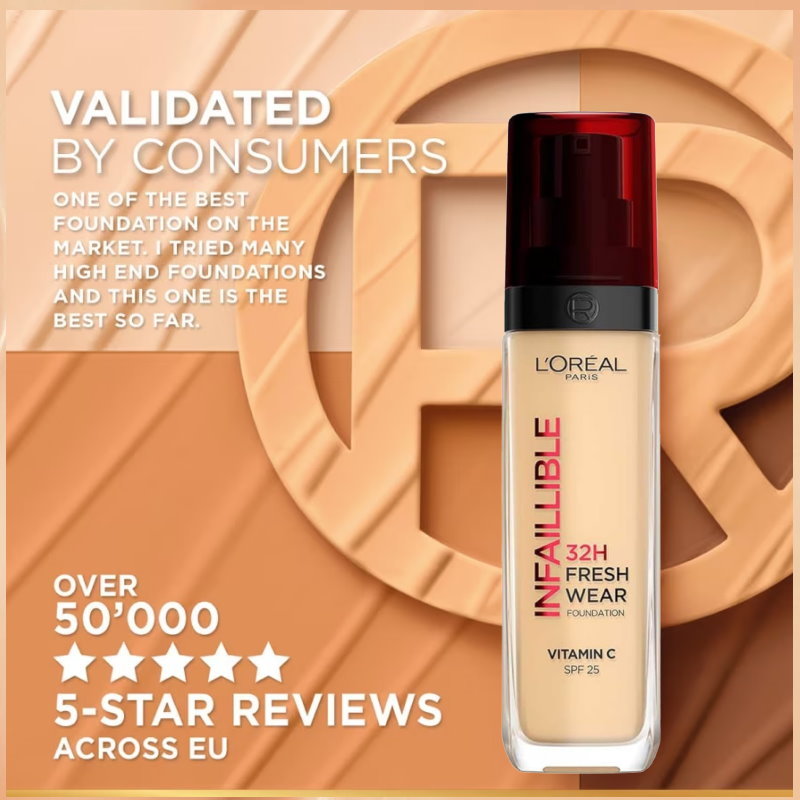 See your skin in its best light yet thanks to the Infallible 32H Fresh Wear Foundation which is both long-lasting and lightweight. L'Oréal Paris presents its most breathable longwear foundation, now formulated with a combination of two powerful ingredients: Vitamin Cg which helps the skin look smoother and brighter in 4 weeks, as well as the light diffusing micro-pearls, making it luminous from the first swipe. Erase your skin's dullness instantly with this long-wear yet lightweight foundation. Designed to last for up to 32hours while still allowing the skin to breathe. A transfer-resistant finish that won’t shift on the skin throughout the day and is resistant against water and sweat. The formula is lightweight with no cakey or heavy feeling and can build to the desired level of coverage. This luminous foundation is available in 24 shades, evenly split between light, medium, and deep tones, so that every skin tone can become flawless, i.e., "Infallible". Our Fresh Wear foundation is designed to be perfect inside and out, featuring a modern and sleek bottle that can be recycled. Indulge in an ultimate skincare and beauty experience, with our buildable, luminous formula that will make your skin feel radiant all day long.