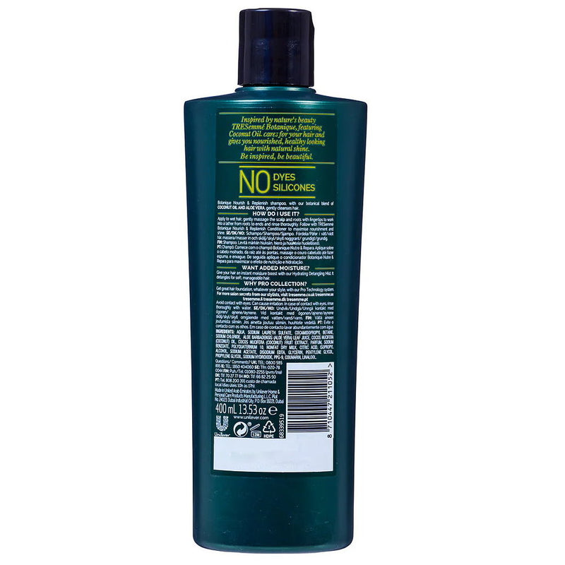 Nourish your hair with TRESemmé Nourish & Replenish Shampoo . This indulgent formula, enriched with coconut oil and aloe vera, provides deep nourishment and replenishes moisture, leaving your hair feeling soft, smooth, and visibly healthy.