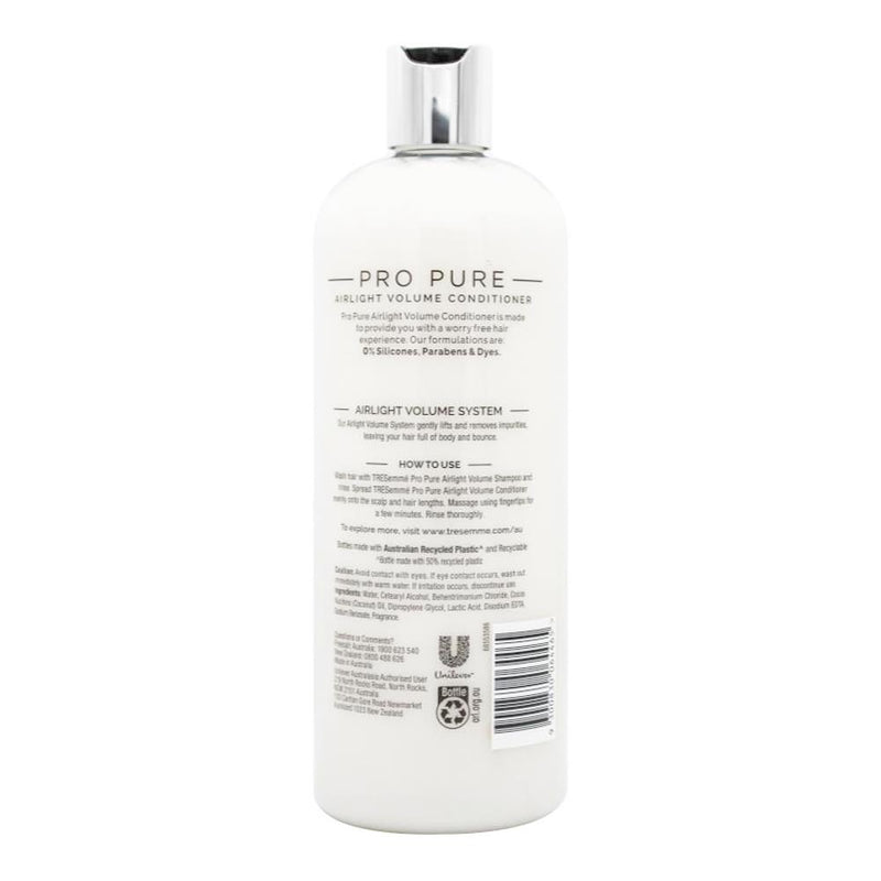 Tresemme's Pro Pure range has 0 sulfates, silicones, parabens or dyes, making it the perfect, weightless hair care that removes impurities. Our Airlight Volume System gently lifts and removes impurities, leaving your hair full of body and bounce. The Pro Pure Airlight Volume Conditioner is made to provide you with a worry free hair experience. Our formulations are: 0% Sulfates, Silicones, Parabens & Dyes. TRESemmé understands how great hair gives you the confidence to walk taller every day. Our Bottles are made in Australia with Australian recycled plastic and recyclable.