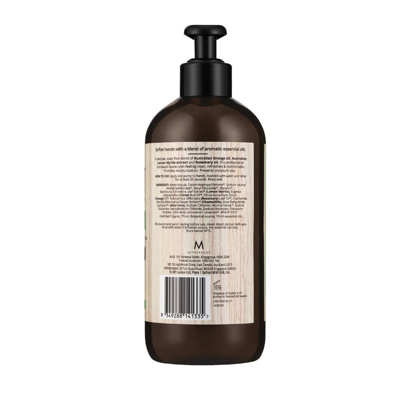Soften hardworking hands with this delicate blend of aromatic essential oils. A delicate, soap free blend of Australian Orange Oil, Australian Lemon Myrtle Extract and Rosemary Oil, this antibacterial hand wash leaves skin feeling clean, refreshed & comfortable.