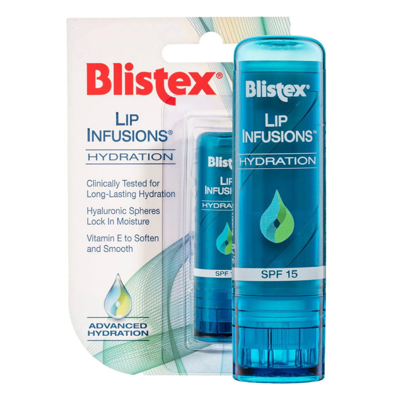 Blistex Lip Infusions Hydration is clinically tested for long-lasting hydration. It's Hyaluronic Spheres lock in moisture, and Vitamin E works to soften and smooth the lips.