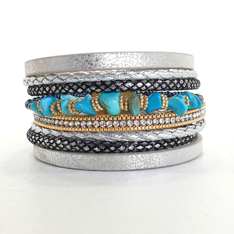 The Rosy Lane Blue Stone Charm Bracelet offers a stylish combination of sparkle, snakeskin pattern, and a secure magnetic clip closure.