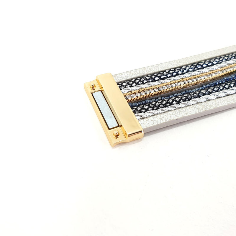 This stylish bracelet is the perfect accessory for any occasion. It is crafted with blue stones, snakeskin like-leather, along with a strong magnetic clip. The bracelet will provide a subtle sparkle and secure fit with every wear.