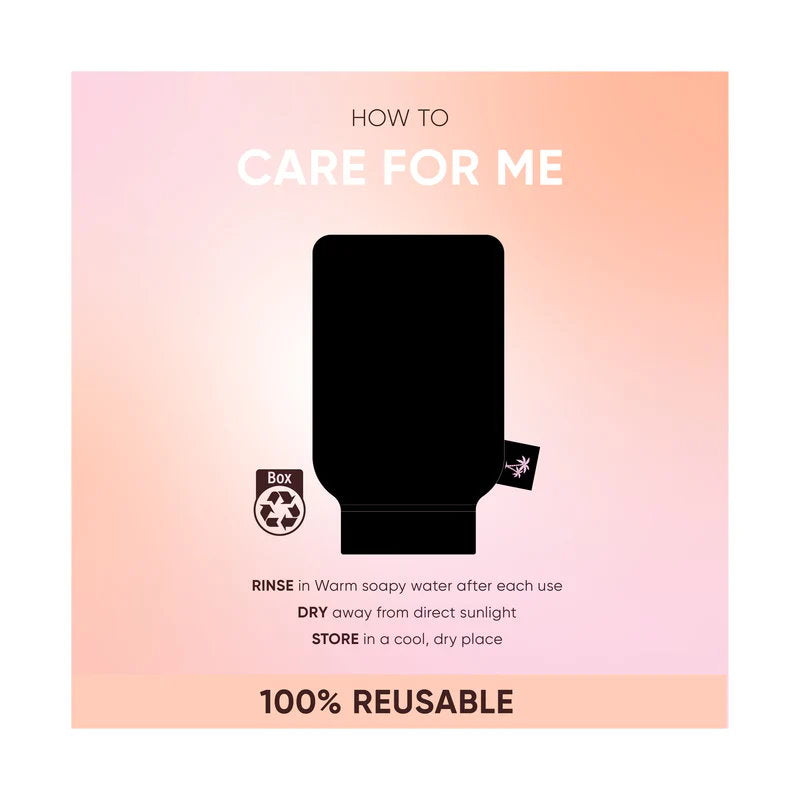 In shower, lather mitt with water and soap and work your way all over the body using circular motions always moving towards the heart. (Wisdom says it's better to massage towards the heart...just sharing). Then rinse clean to remove all residue and hang to dry - away from direct heat.